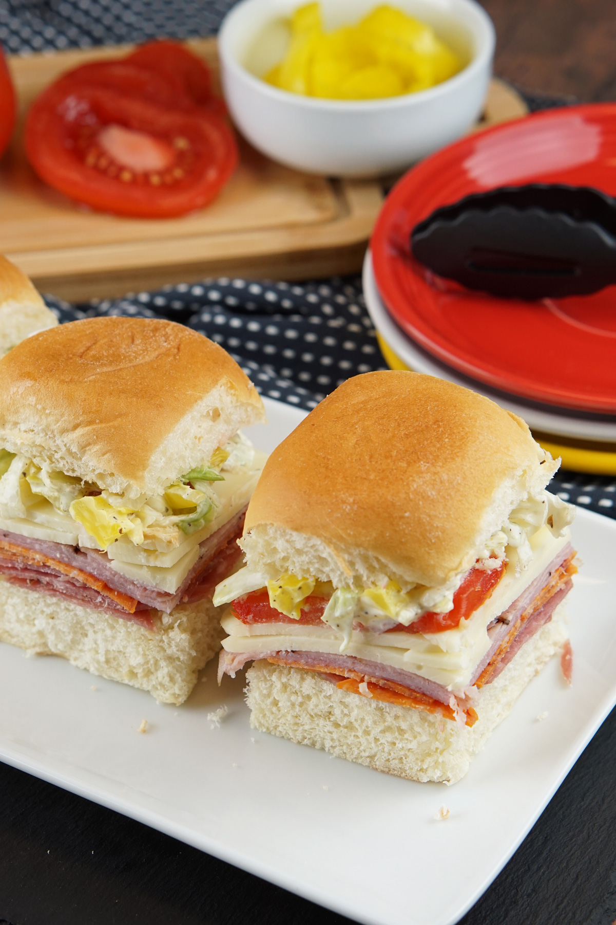 - Start layering the sliders by adding a generous amount of salami, pepperoni, ham, and provolone cheese. Add a slice of tomato on top of each slider.